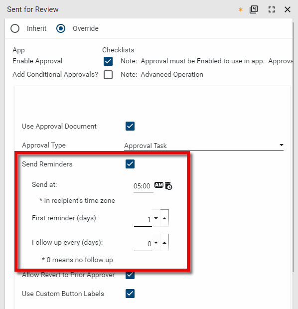 Send Reminders If Use Reminder Defaults is not selected, this option becomes available and you can select it to send reminders for this step on a custom schedule.