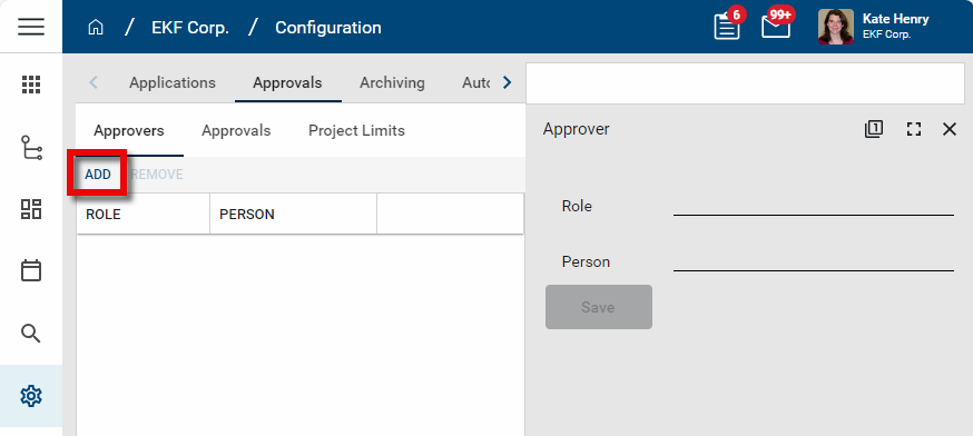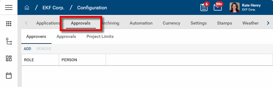 Select the Approvals tab. There are three sub-tabs, Approvers, Approvals, and Project Limits. Select the Approvers tab.