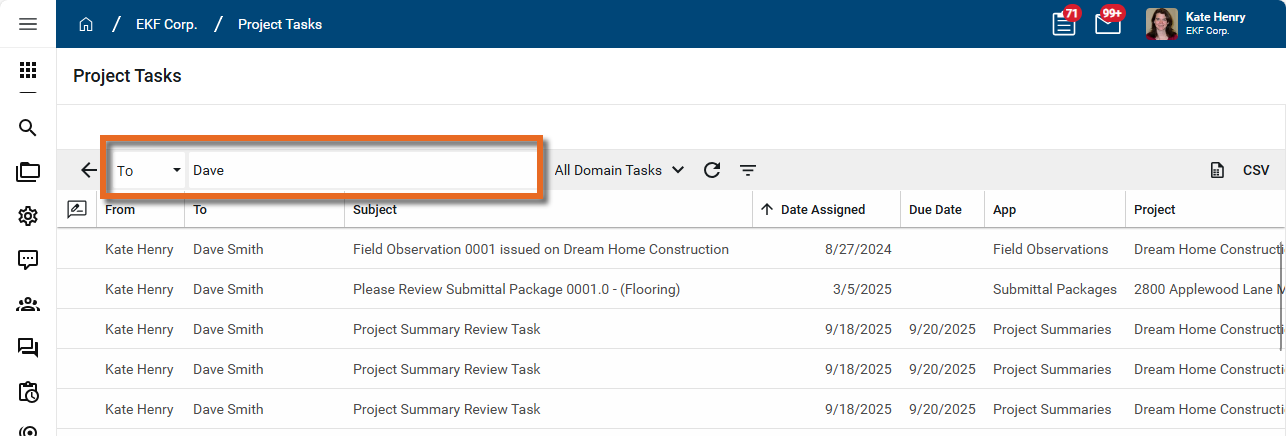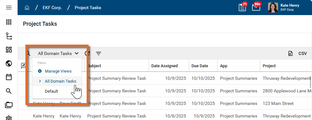 The Project Tasks app allows administrators to access all open tasks in the currently open project. From the app, administrators can review a list of open tasks in a project or the entire domain, determine who each task is assigned to, view the task source record, delegate that task to another user, and view the history of that task.