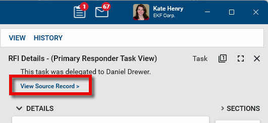 The source record of a task is the underlying document that generated the task. For example, when a user is assigned a task to respond to an RFI, the original RFI is the source record. While the task contains the information necessary to respond to the RFI, you can view the source record to see all the information contained in the original RFI record.