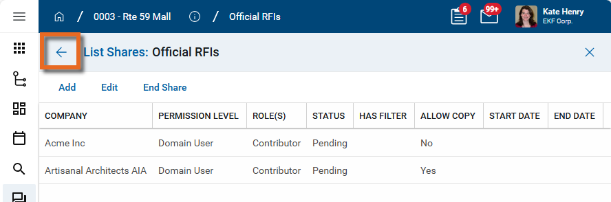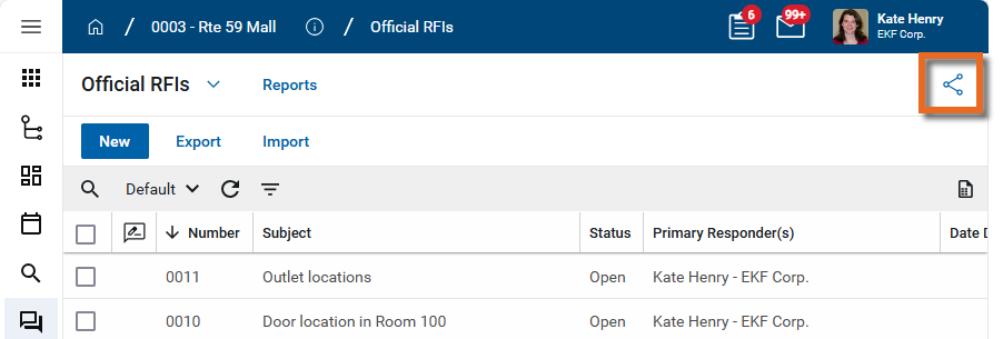 A powerful feature of the Kahua platform is the ability to share project information across domains. For example, a general contractor can share a project's RFI log or submittal log on a project with the subcontractors on that project, ensuring everyone is on the same page. For more general information on sharing in Kahua, refer to Understanding how Kahua sharing works.