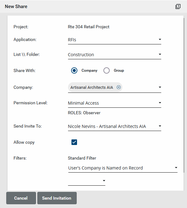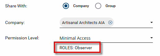 Select the name of the group with the appropriate permissions for this application. Once you select the group name, the roles assigned to the group appear below the selection. For more information on assigning permissions in the Groups app, refer to Manage permissions for a group. Example If you are a general contractor and want to allow your subcontractors to view RFIs for a project in your domain, you can set up a group with Observer permissions for RFIs and select that group here. Note This selection can be edited after the share is accepted. |