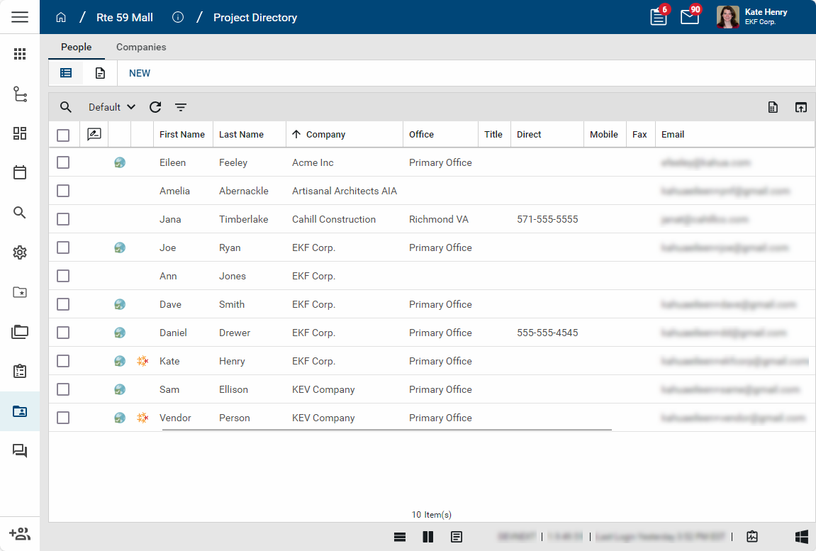 The Project Directory app contains a list of the contacts and companies associated with a project. Throughout Kahua, most contact selection lists can be narrowed down to the contacts in the project directory for the currently open project.
