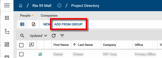 Contacts can be added to the project directory in several ways: one at a time by selecting New on the People tab and completing the appropriate fields; as a group by selecting Add From Group on the People tab; or with their company by updating the Team Contacts section for their company on the Companies tab.