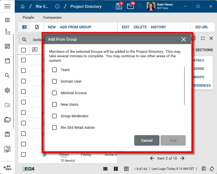 The Add from Group page opens. Select one or more groups to add their members to the project directory for the currently open project. Click Add.