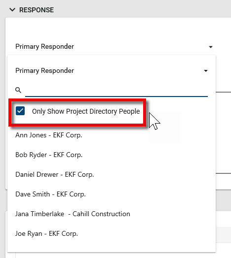 After people have been added to the Project Directory app, the Only Show Project Directory People option will be available on the contact selection fields in all other apps. When selected, only contacts associated with the Project Directory will appear in the selection list. Clear the check box to see all contacts from the Contacts app.