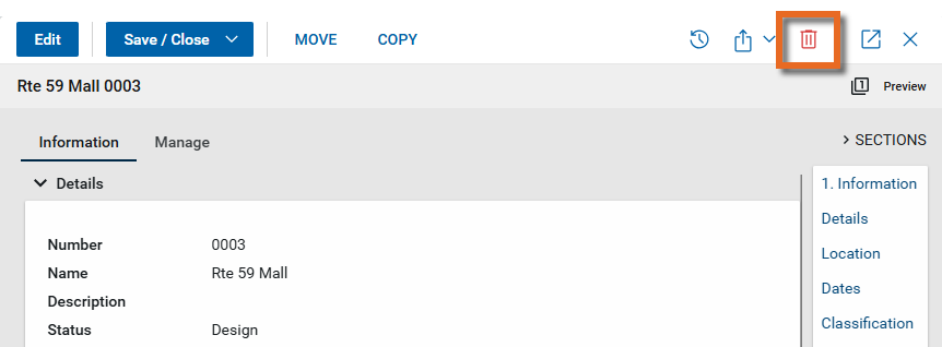 Users with the appropriate permissions are able to delete a project from this page. Typically you would only delete a project if it were created in error and did not contain any data that you wanted to preserve.