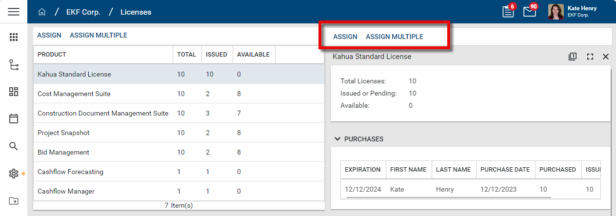 Select Assign in the action bar to assign the selected license to a user. Select Assign Multiple to assign multiple licenses to multiple users at one time. If you attempt to assign a license to a user who already has that license, the system will ignore that request.